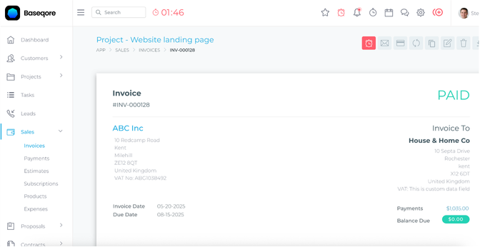 Baseqore helps you manage your entire business. Send proposals, sign contracts, track billable hours, create invoices, and receive payments all in one place.